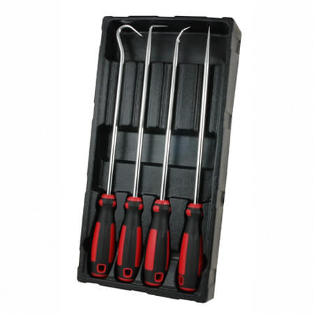The 4-Piece Mini Hook and Pick Set is perfect for pulling and removing wires, gaskets, washers, O-rings, and other small parts. Hooks and pick feature a high-strength, heat-treated chrome vanadium steel construction with knurled grip sections for precise control. Comfortable rubber handles provide a non-slip grip during use. Swivel end caps allow for constant finger pressure while turning or positioning. The set meets or exceeds ANSI standards and is backed by a lifetime replacement guarantee. Set Includes: (1) Full Hook; (1) 45-degree Hook; (1) 90-degree Hook; (1) Straight Pick